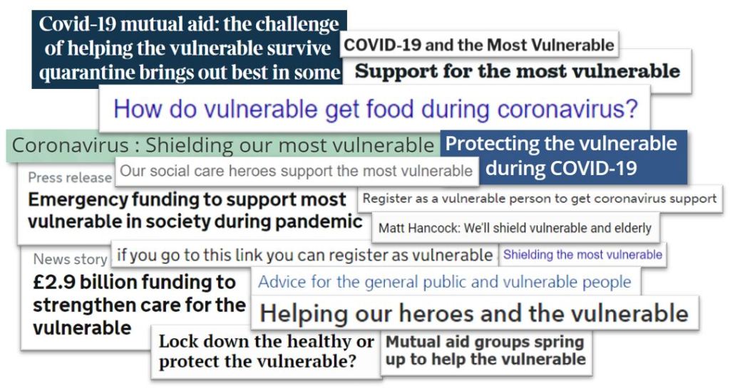 During the pandemic, the focus has been on ‘the most vulnerable’ – an anonymous group rarely defined but implied to be the people on the ‘Shielded patients list’ [8]. This list is collated by NHS Digital and provided to GPs, hospitals and – via the Cabinet Office’s ‘Extremely Vulnerable Persons service’ to local authorities. If you’re on the list, you’re entitled to ‘get coronavirus support as a clinically extremely vulnerable person’ [9]. If you’re not on the list – you’re either not vulnerable enough or you’re the wrong kind of vulnerable.