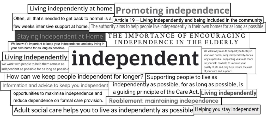 We generally imply that living in ‘your own home’ equates to independence, and that any support you draw on in ‘your own home’ will ‘allow you to remain independent’.